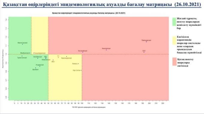 Матрица оценки эпидемиологической ситуации в регионах Казахстана на 26 октября 2021 года: