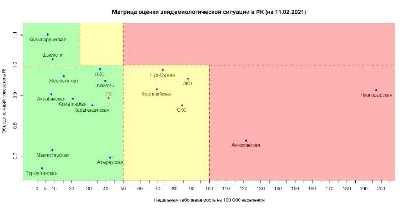 Опубликована матрица оценки эпидемиологической ситуации в регионах Казахстана на 11 февраля 2021 года, передает Caravan.kz.