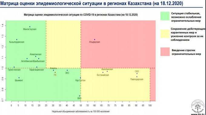 С учетом данных на 18 декабря, в "желтой" зоне находятся Костанайская, Павлодарская, Акмолинская и Северо-Казахстанская области.