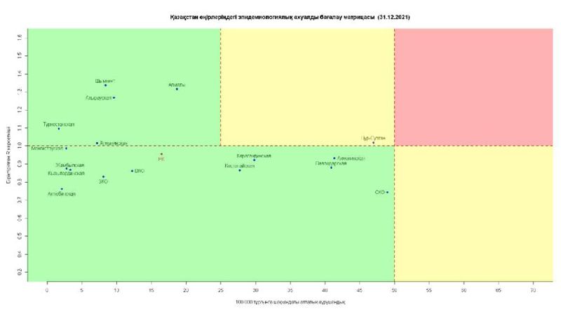 В «зеленой» зоне: Алматы, Шымкент, а также Акмолинская, Атырауская, Актюбинская, Алматинская, Западно-Казахстанская, Туркестанская, Жамбылская, Кызылординская, Карагандинская, Костанайская, Мангистауская, Павлодарская, Северо-Казахстанская, Восточно-Казахстанская области.