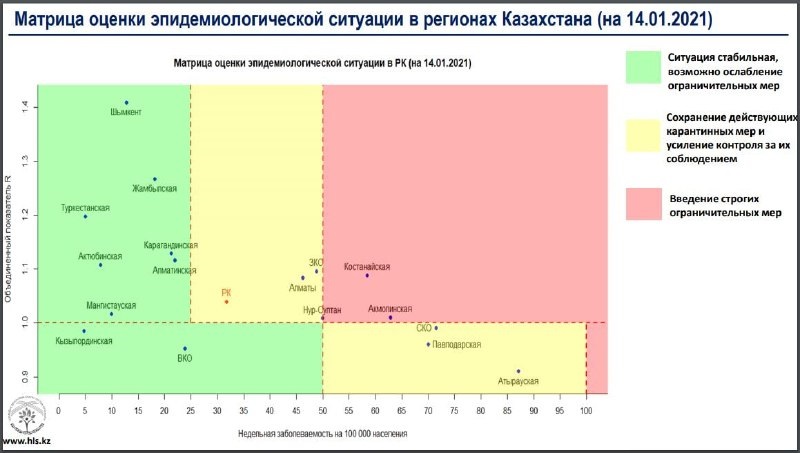 В "желтой" зоне: города Нур-Султан и Алматы, Атырауская, Западно-Казахстанская, Северо-Казахстанская, Павлодарская области.