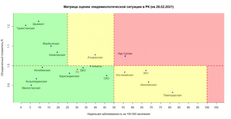 Нур-Султан вновь вошел в "красную" зону по распространению коронавируса. Об этом свидетельствует матрица оценки эпидемиологической ситуации в регионах Казахстана на 28 февраля 2021 года, передает корреспондент Tengrinews.kz.