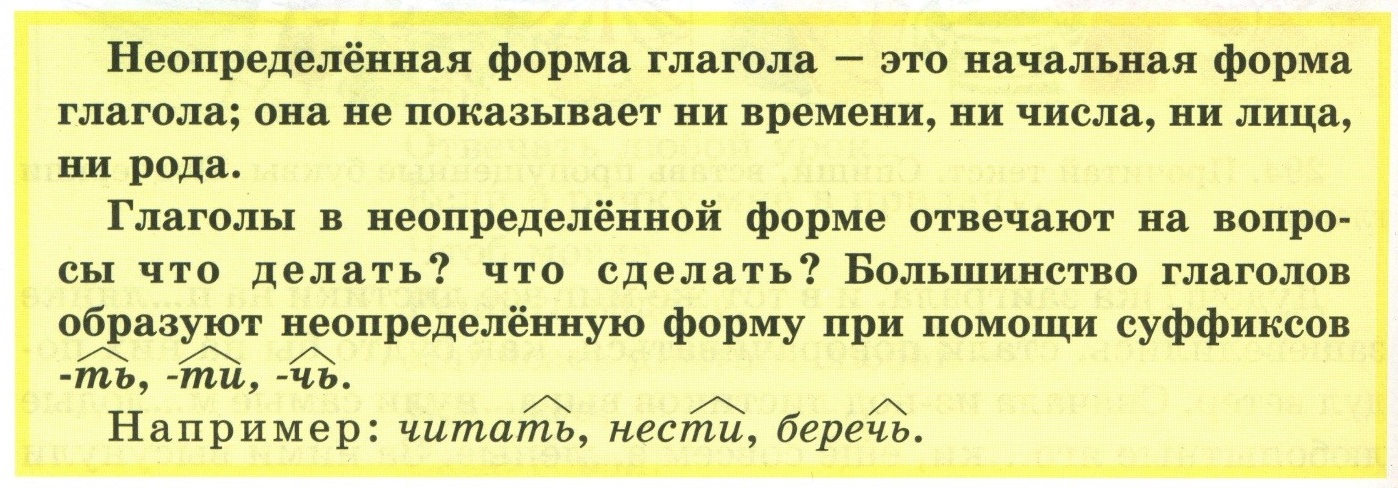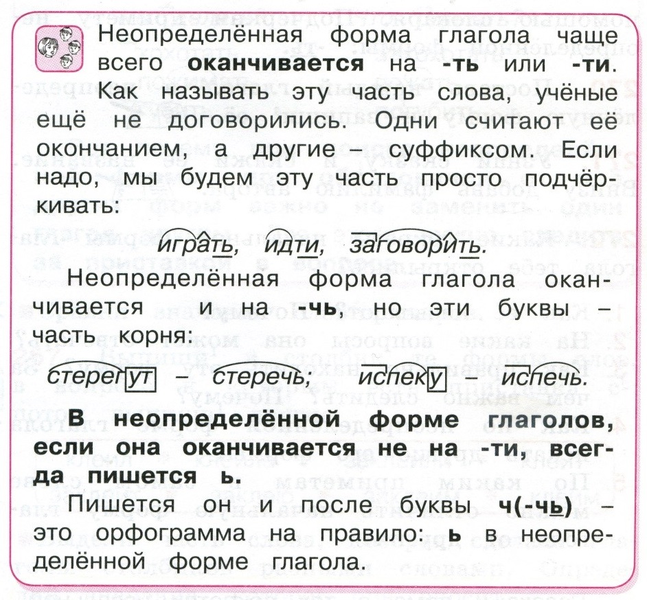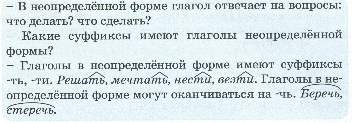 Обратите внимание: в первом случае в слове «беречь» -ЧЬ – часть корня, во втором учебнике это суффикс, а в российском учебнике ни то и ни другое. Дело в том, что в науке до сих пор «-ТЬ» – это спорный вопрос. И, чтобы не давать детям информацию, которая вызывает споры в научной среде, в ряде российских учебников сказано: «Глаголы в неопределенной форме оканчиваются на -ть, -ти, -чь».
