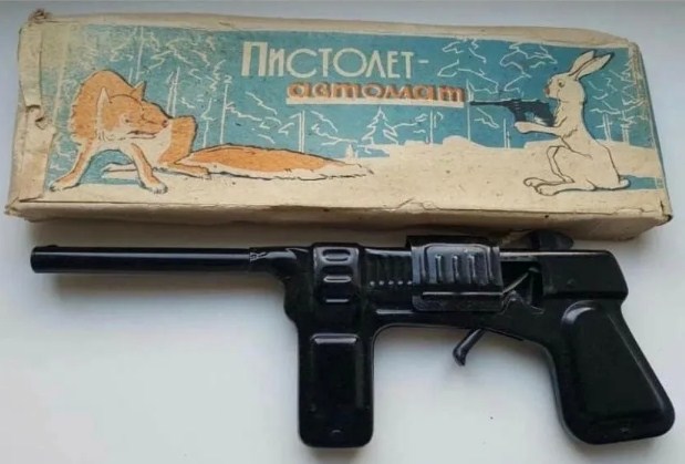 Пистолет-автомат с пистонами был еще прочнее, потому что полностью состоял из металла, но его дизайнеры сильно просчитались. Очертаниями игрушка больше напоминала «шмайсер», и родители, положившие автомат под елочку, и не подозревали, что их чаду в уличных боях придётся быть за «немцев»