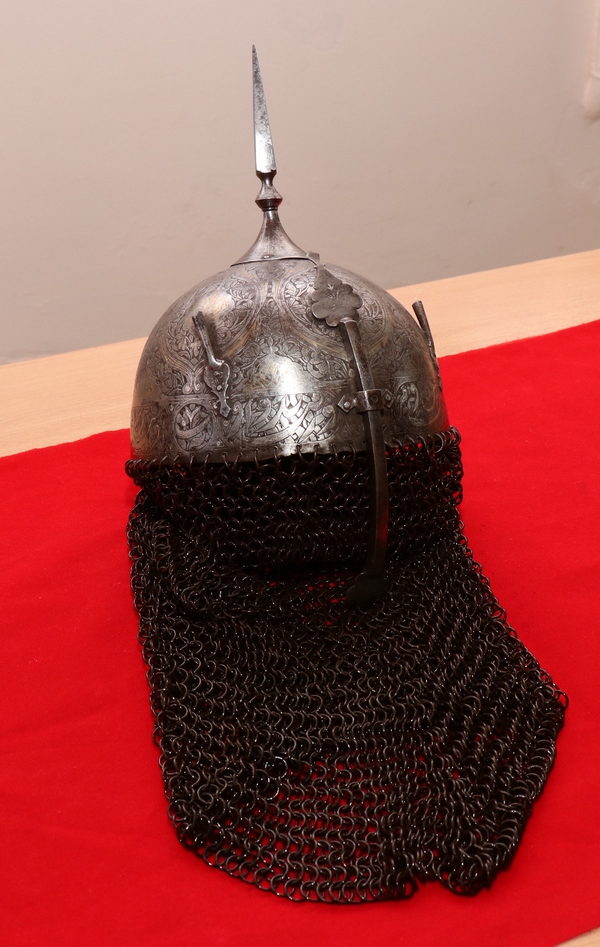 — В музее хранятся артефакты 18-19-го веков, например, налокотник, седло и сбруя. Седло – подарок жителей Райымбекского сельского округа, выполнено из кожи, украшено серебряными бляшками, — продолжает Орынбасар Талимжанович. — У каждого рода были свои отличительные особенности, найманские седла отличались от керейских. Есть фитильное ружье, пороховница 19-го века. Шлем из железа с защитной кольчугой (18-19-й век) прошел реставрацию. Кольчуга, защищающая шею воина, была повреждена, мастера ее восстановили, и скоро шлем будет представлен в экспозиции. На нем можно увидеть орнамент в иранско-персидском стиле. Весит артефакт около 5 килограммов. Ценный экземпляр нашей коллекции — сабля сестры Кенесары-хана — Бопай-ханым. Изготовлена в 1845 году в Санкт-Петербурге.