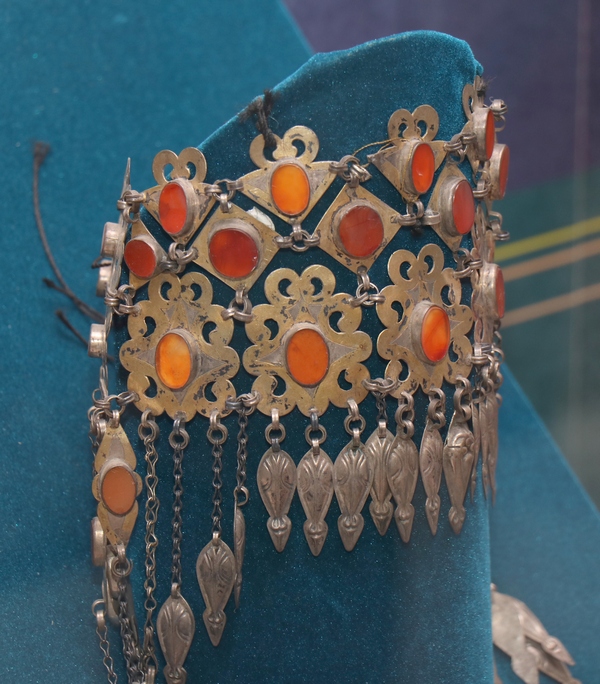 — Вот старинный кошелек, мы сейчас похожие сумочки носим для мобильных телефонов, — заметила наша собеседница. — Самое старинное украшение коллекции – туркменское нагрудное, гурсакча (19-й век), — выполнено из белого, желтого металлов. Мастера их щедро украшали камнями. Современные зергеры делают копии старинных украшений. Восточная женщина могла носить на себе несколько килограммов металла.