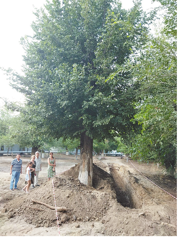 При этом показывают мне траншею для прокладки труб теплоцентрали, сооруженную почти впритык к огромному дереву.