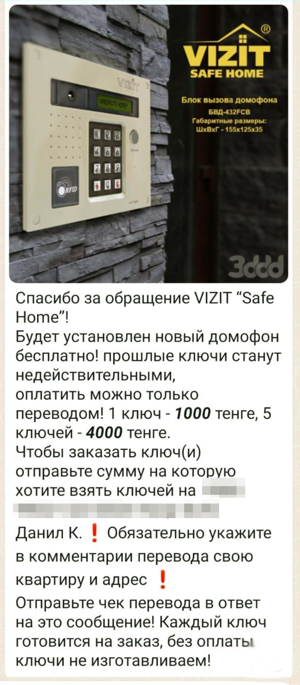 Жильцов многоквартирных домов оповещают о том, что 12 октября якобы будет проводится замена домофонов за счет управляющей компании и старые ключи будут недействительны. В объявлении также сказано, что в тот же день, 12 октября будет проводится обход и раздача ключей по заявкам, ниже указан телефон «для заказа» ключей. После звонка на WhatsApp приходит сообщение от некой компании VIZIT «Safe Home», в котором предлагают заказать один ключ за 1000 тенге, пять ключей за 4000 тенге. Деньги для предзаказа нужно скинуть некому Данилу К. Причем номер больше напоминает номер счета в банке. В конце сообщения злоумышленники просят отправить чек перевода, указать свою квартиру и адрес.