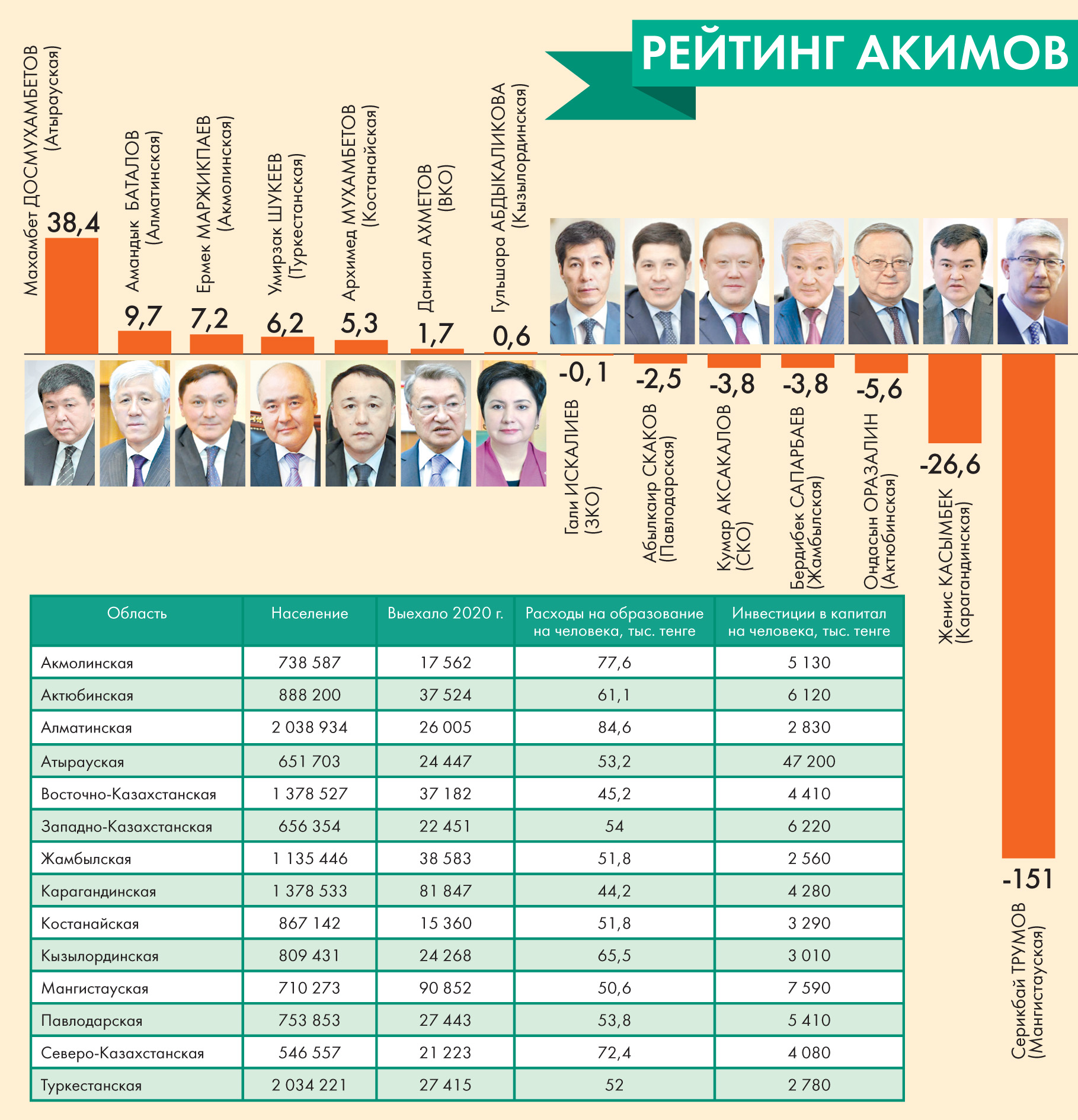 В нашем рейтинге сразу бросаются в глаза 2 лидера со знаками плюс и минус: аким Атырауской области Махамбет Досмухамбетов (+38,4) и аким Мангистауской области Серикбай Трумов (-151). Так как индекс ориентирован на показатель миграции, для небольших регионов выезд одного человека более значим, чем для густонаселенных. Поэтому даже небольшой “чемодан-вокзал” из Атырауской области – 24,4 тысячи человек, оказался значимым фактором.