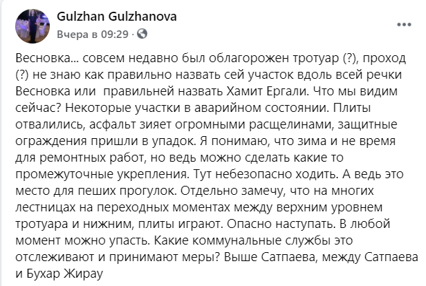 "Совсем недавно был облагорожен участок вдоль речки Весновка. Что мы видим сейчас? Некоторые участки в аварийном состоянии. Плиты отвалились, асфальт зияет огромными расщелинами, защитные ограждения пришли в упадок. Я понимаю, что зима и не время для ремонтных работ, но ведь можно сделать какие-то промежуточные укрепления. Тут небезопасно ходить. А ведь это место для пеших прогулок. Отдельно замечу, что на многих лестницах на переходных моментах между верхним уровнем тротуара и нижним, плиты "играют". Опасно наступать. В любой момент можно упасть", — пожаловалась жительница города в паблике.
