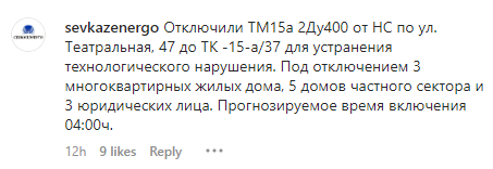 В "СЕВКАЗЭНЕРГО" подтвердили информацию и уточнили: "Под отключением 3 многоквартирных жилых дома, 5 домов частного сектора и 3 юридических лица. Прогнозируемое время включения 04:00". Позже они сообщили, что работу закончили раньше срока.