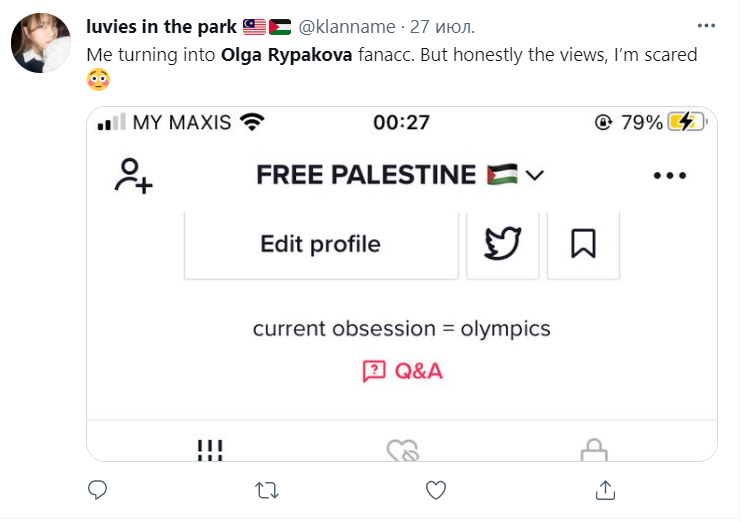 Пользователи даже заявили, что в соцсетях уже появились фан-аккаунты Ольги Рыпаковой. Правда, почему-то в них зачастую появляется политический контекст с призывом "освободить Палестину",