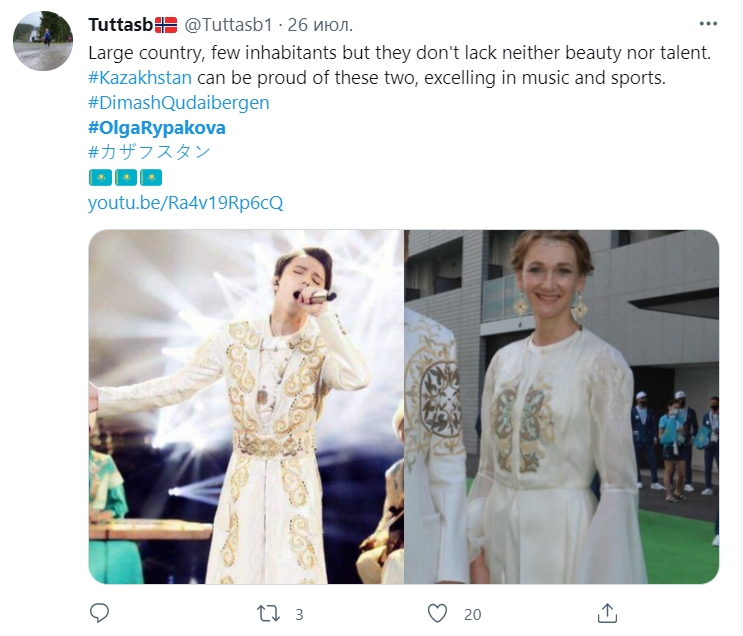 "Огромная страна с небольшим населением, но недостатка таланта или красоты вообще не чувствуется. Казахстан может гордиться этими двумя — великолепные достижения в музыке и спорте", — гласит пост.