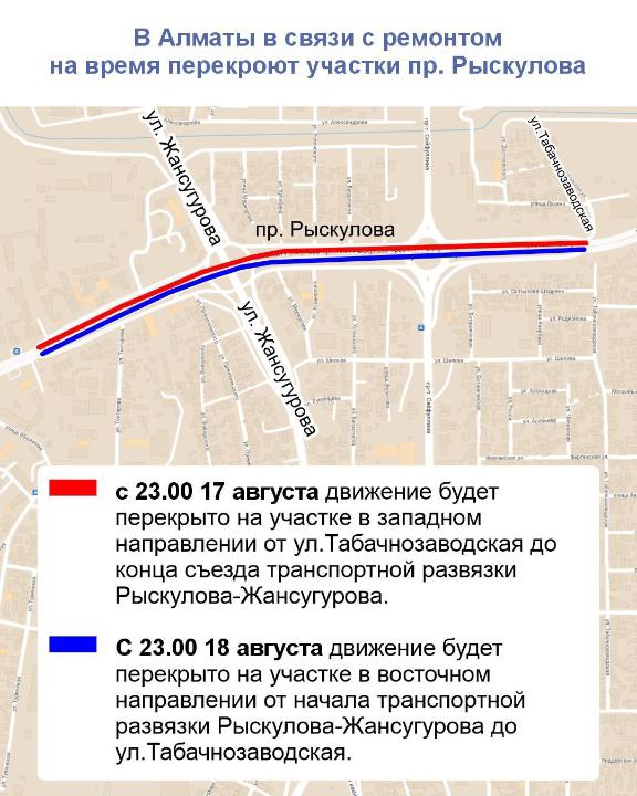Как сообщает акимат Алматы, с 23:00 18 августа до 11:00 20 августа движение будет перекрыто на участке в восточном направлении от начала транспортной развязки Рыскулова — Жансугурова до ул. Табачнозаводская.