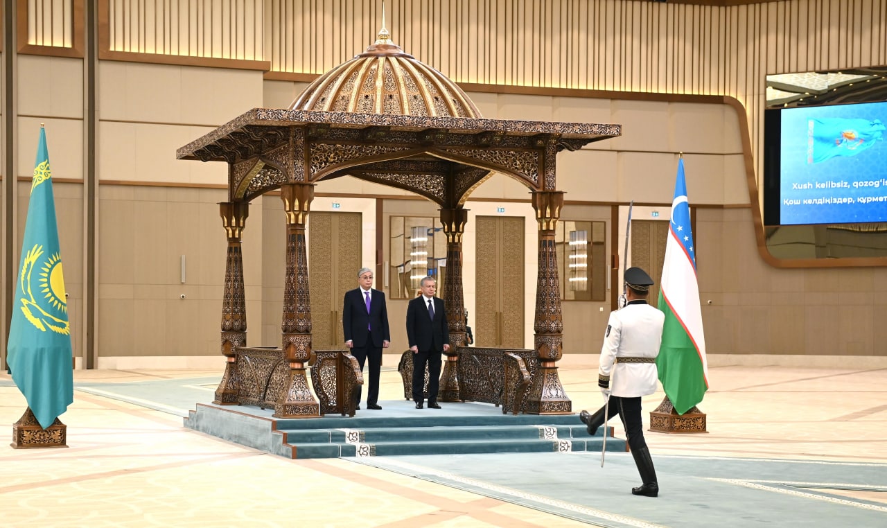 Лидеры двух стран приняли приветственный рапорт начальника роты почетного караула, прозвучали государственные гимны Казахстана и Узбекистана.