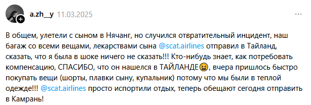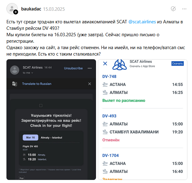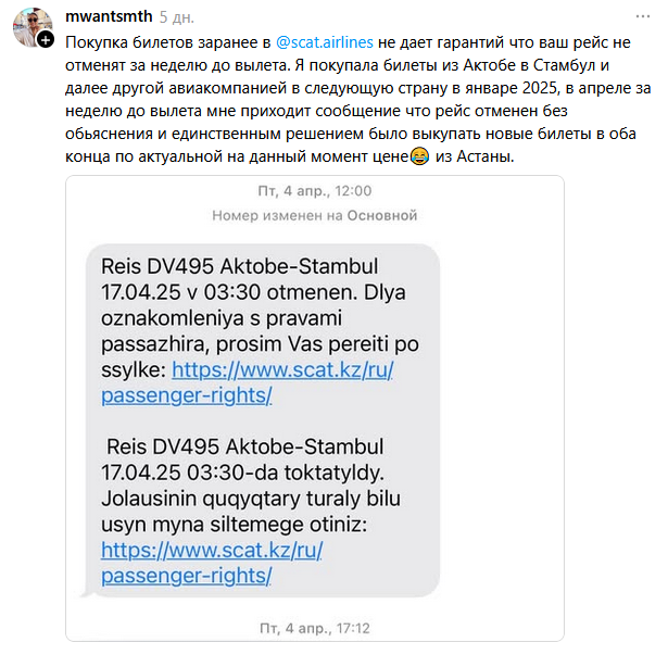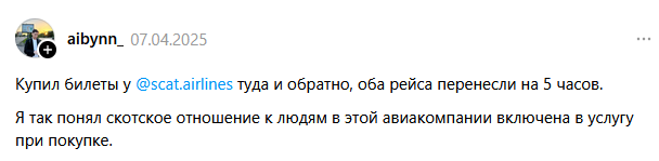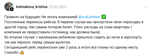Это больная тема для многих, некоторые из которых даже не смогли улететь самолетом SCAT. У недовольных пассажиров полно историй о том, как билеты были куплены за месяцы до нужной даты, а потом рейс внезапно отменили, и пришлось тратить сумму ощутимо больше. Также хватает и случаев, когда из-за переноса кто-то пропустил стыковку в другой стране.