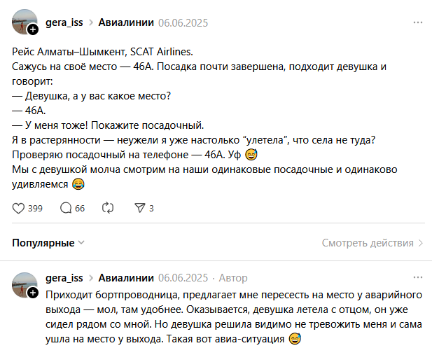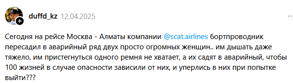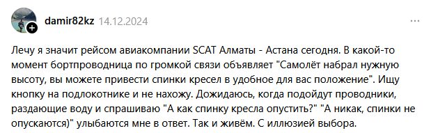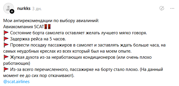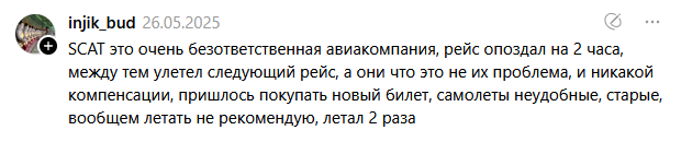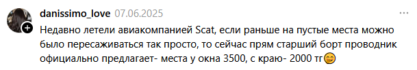 Тому, что выбор любого места при бронировании стал платным, многие не рады. В конце концов, это типичная практика лоукостеров, а SCAT не позиционирует себя таковым. Но тут пассажиры со скрипом, но соглашаются – компания в своем праве.