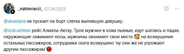 «В аэропорту Атырау пассажира авиакомпании SCAT сняли с рейса из-за багажа с рыбой, о котором он не знал. Сотрудники авиакомпании оформили багаж на пассажира без его ведома. Позже он вызвал подозрение у транспортной полиции. Пассажира так и не допустили к рейсу», — сообщает Telegram-канал Egovpress.