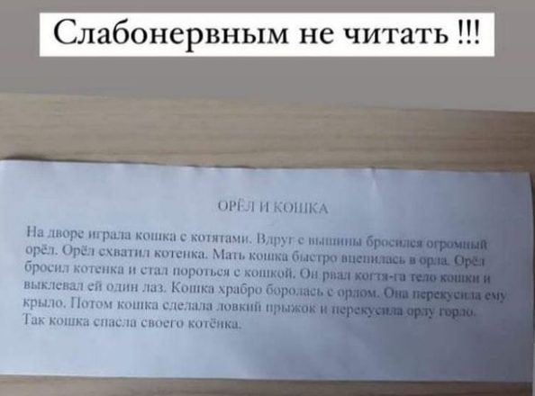 В посте поделились распечатанной версией рассказа Константина Ушинского "Орёл и кошка". И в оригинале, и в вольной интерпретации текста есть такие мрачные подробности, как разрывание тела кошки когтями и выклёвывание её глаза. В Интернете можно найти поурочные планы для четвёртых и пятых классов, в которых предлагается разобрать этот текст с учениками.