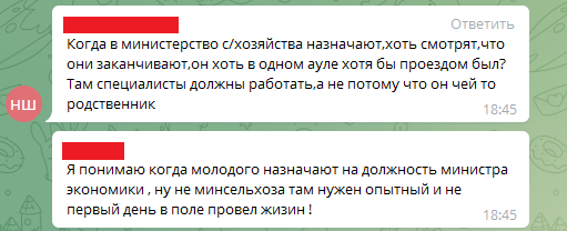 Недовольство пользователей в комментариях, в частности, сводилось к тому, что назначать молодого, неопытного кадровика на одну из руководящих должностей в сельскохозяйственной отрасли, с которой в Казахстане ежегодные проблемы – это не самое лучшее решение. Плюс к этому пошли рассуждения о том, мол, молодой человек «явно чей-то родственник» и прочее.
