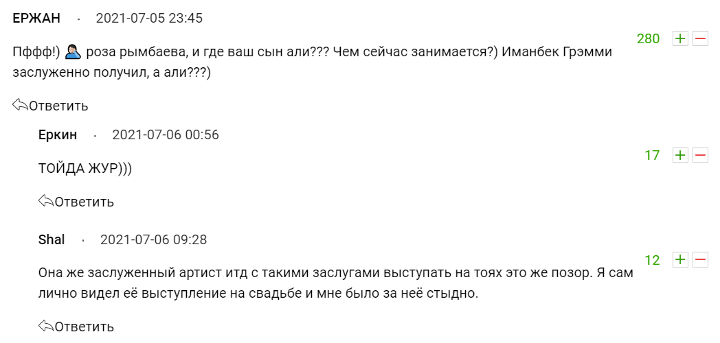 Стоит отметить, что многие казахстанские пользователи очень резко восприняли высказывание Розы Куанышевны в адрес первого казахстанца, получившего премию "Грэмми". Многие отмечали, что он поступил правильно, так как не стал ввязываться в споры.