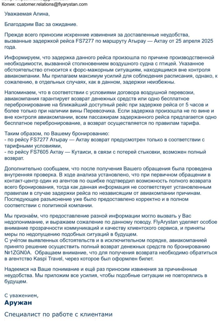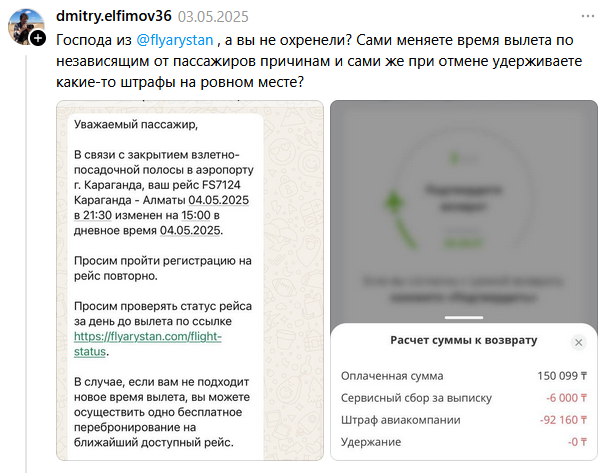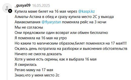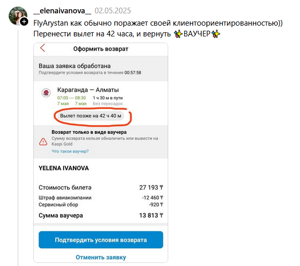 «FlyArystan оформили полный возврат, деньги поступили, опять же с боем, на этот раз уже с банком. Очень важно знать свои права и не сдаваться! Они рассчитывают, что вы забудете или устанете ждать. Не давайте им такого шанса!» — заключила женщина.