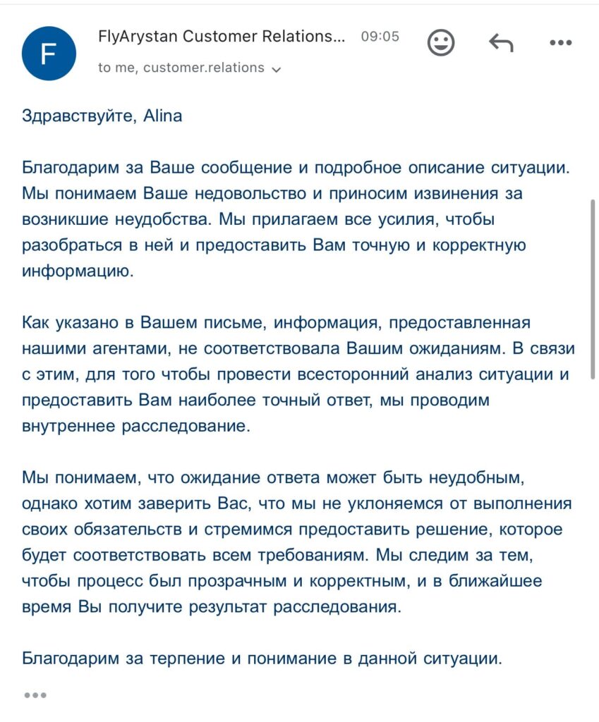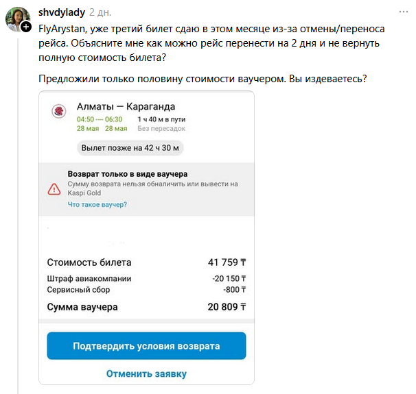 Многие прямо пишут, что предпочли бы любую другую авиакомпанию, но по некоторым направлениям другие перевозчики не летают. Например, одна казахстанка поделилась, как с трудом добилась возврата своих денег. Она требовала вернуть ей полную стоимость потерянных билетов, без каких-либо дополнительных компенсаций. Женщина приложила и скриншоты, которые подтверждают противоречия в информации, полученной от сотрудников компании.