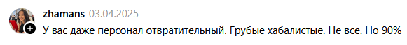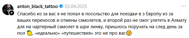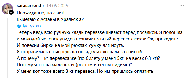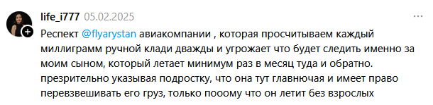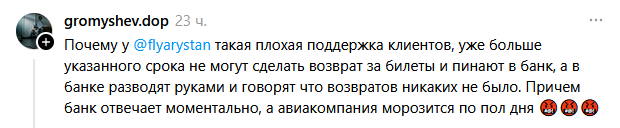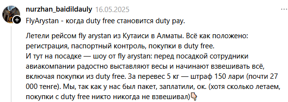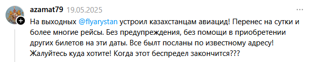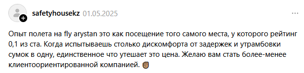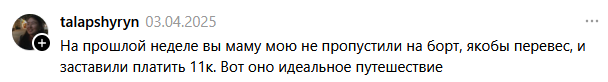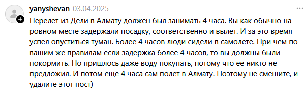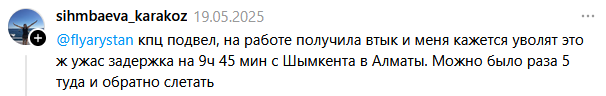 «Попала в такую же ситуацию, тот же рейс, тот же день, но билеты были куплены отдельно, мы пропустили бы рейс из Актау в Баку. Когда спрашивали о возврате, нам сказали: только ваучером, а мне пришлось на такси в Актау ехать, и как бы ваучер как оплата там не проходит. Далее сотрудница говорила нам, что ситуация произошла не по их вине, это авария или что-то такое, и я как бы понимаю, но не понимаю, почему я должна платить за это, ведь и не по моей вине тоже это произошло, но я всё-таки заплатила за это. И самое смешное, что мне кажется, у авиакомпаний на такие случаи предусмотрена страховка, так что они финансово вообще никак не пострадали, а вот мы — да. А самое ужасное, что мы никак не можем закэнселить эту авиакомпанию, потому что других рейсов тупо нет! В общем, вот такие они, отвратительные FlyArystan», — поделилась она.
