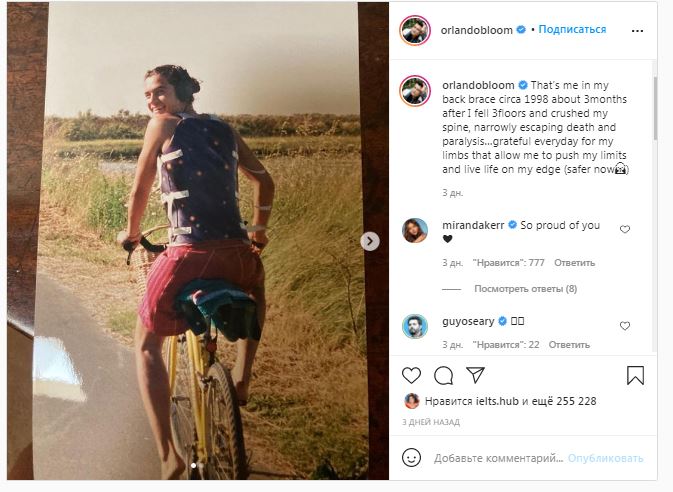 Британский актер Орландо Блум рассказал, что едва не умер в 1998 году после падения с третьего этажа. Пост на эту тему он опубликовал в своем Instagram-аккаунте, пишет Lenta.ru