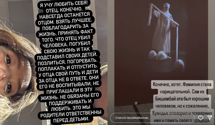 «Конечно, хотят. Фамилия стала нарицательной. Сам их Бишимбай-ата был хорошим человеком, но, к сожалению, Куандык опозорил и осквернил имя и память своего прадеда», — написала Кахарман.