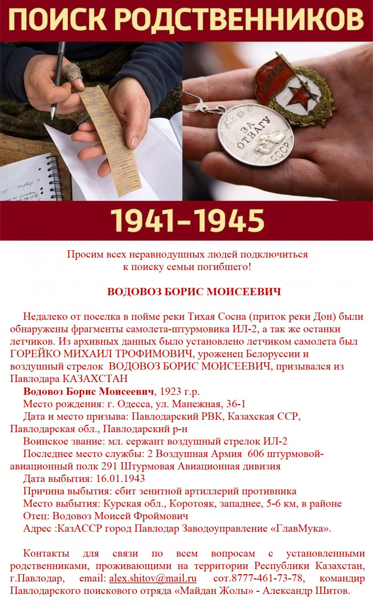 — К нам обратился житель Воронежской области, который рассказал, что в ходе раскопок недалеко от поселка Луки в пойме реки Тихая Сосна найдены фрагменты самолета-штурмовика Ил-2, а также останки двух летчиков. Одним из погибших оказался Борис Моисеевич Водовоз из Павлодара, — рассказал командир отряда "Майдан жолы" Александр Шитов.