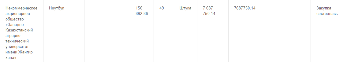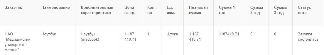 19 апреля 2019 года медицинский университет Астаны опубликовал лот на покупку 30 ноутбуков по 232 053 тенге за штуку. Общая сумма закупки обошлась госбюджету в 6 961 607 тенге.