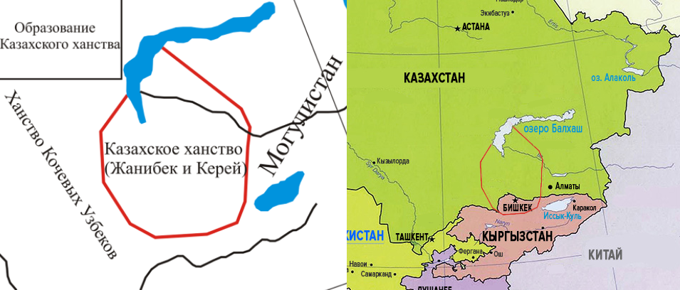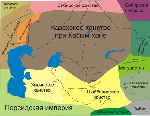 В конце XV века ханы Жанибек и Керей создали собственное государство в Семиречье. Сначала их владения были сравнительно небольшими. Но после смерти Абулхаира в Узбекской Орде начались распри, которые привели к тому, что Жанибек без боя присоединил эти земли к своим. К началу XVI века власть Казахского ханства распространилась и на восточный Дешт-и-Кипчак. Выглядело это примерно так.
