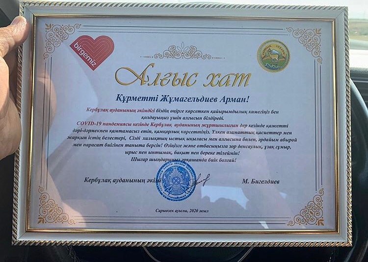 Он разместил на своей странице в социальных сетях фотографию Почетной грамоты… за вклад в борьбу с коронавирусом в Казахстане! В тексте говорится, что в период пандемии Арман Джумагельдиев обеспечивал население района лекарствами для лечения COVID-19. Судя по фотографии, грамоту подписал аким Кербулаксого района Алматинской области Махаббат Бигельдиев.