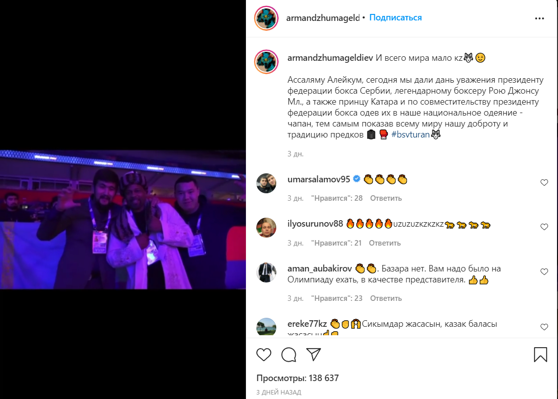Сомнения также вызывает и тот факт, что в соцсетях криминальный авторитет опубликовал видео, где сидит на почетном месте рядом с легендарным боксером Роем Джонсом. Джумагельдиев даже подарил ему традиционный казахский чапан, а тот в свою очередь передал привет казахстанским болельщикам.
