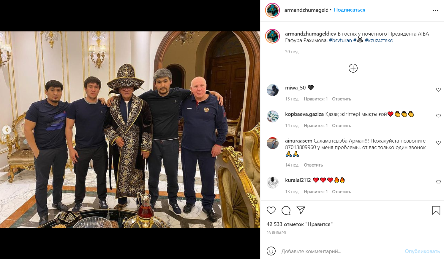 Кроме того, криминальный авторитет, а ныне народный любимец Арман Джумагельдиев успел встретиться с почетным президентом Международной ассоциации бокса (AIBA) Гафуром Рахимовым.