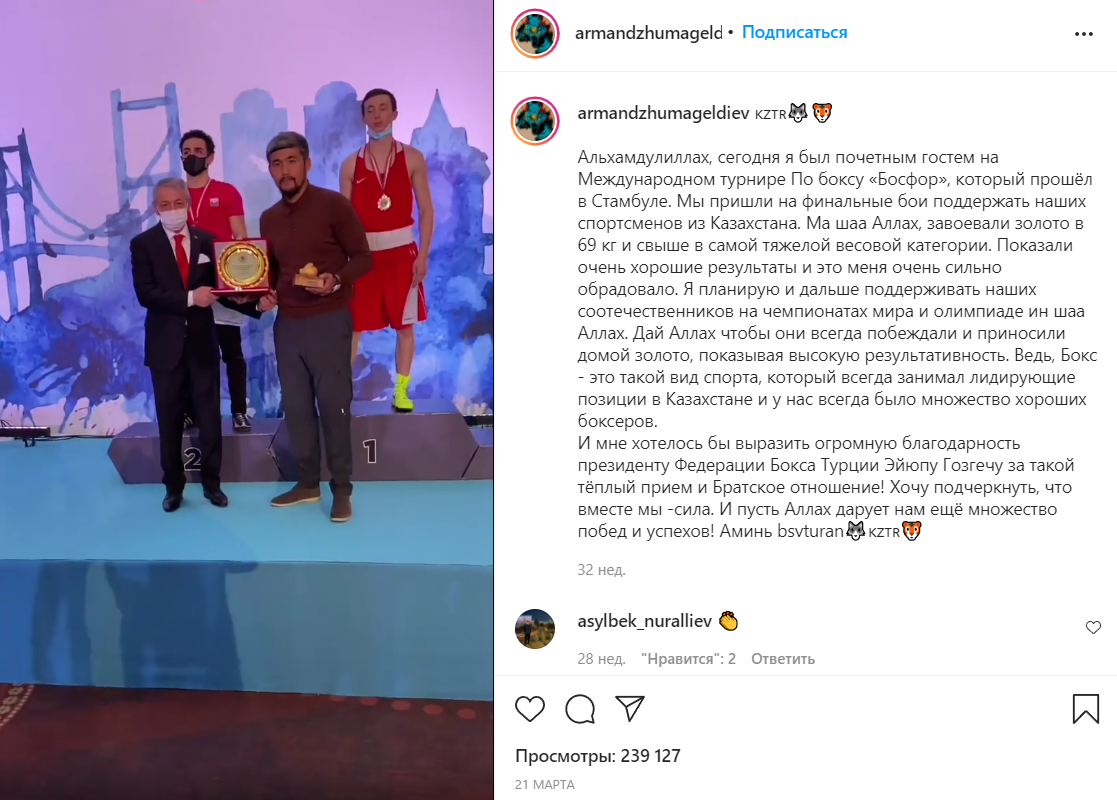 Позднее в соцсетях распространилась еще одна запись, где он говорит слова напутствия боксеру Асланбеку Шымбергенову перед боем в Белграде.