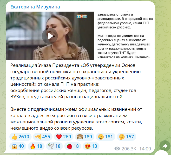 В своем телеграм-канале она опубликовала юмористический ролик с телеканала, а также сообщение от подписчика, который просит провести проверку в связи с «русофобным номером, где студентка Григорьева жалуется преподавателю-казаху на отсутствие секса». Сама Мизулина назвала видео разжигающим межнациональную рознь и к тому же несмешным, передает Caravan.kz со ссылкой на secretmag.ru.