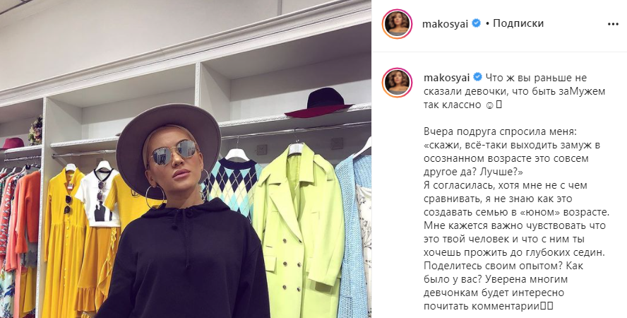 «Что ж вы раньше не сказали, девочки, что быть замужем так классно? Вчера подруга спросила меня: "Скажи, все-таки выходить замуж в осознанном возрасте — это совсем другое, да? Лучше?". Я согласилась, хотя мне не с чем сравнивать, я не знаю, как это — создавать семью в "юном" возрасте. Мне кажется, важно чувствовать, что это твой человек и что с ним ты хочешь прожить до глубоких седин", — высказалась певица на своей странице в Instagram.