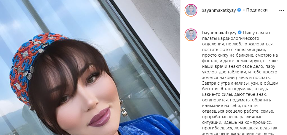 Кроме того, известный продюсер напугала подписчиков тем, что лежит в больнице, в отделении кардиологии. Однако на данный момент Баян Максатовна выписалась, чувствует себя хорошо и даже успела еще раз побывать в Турции.