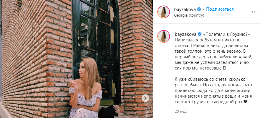 Также г-жа Байзакова посетила столицу и рассказала о своих приключениях при заселении в отель. Кроме того, блогер съездила в Грузию и призналась подписчикам, что «эта страна спасла ее в очередной раз».