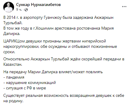 Правозащитник высказался насчёт казахстанки Акжаркын Турлыбай и девушки из Ростова Марии Дапирки: "ЦАРИКЦом (прим. ред: "Центральноазиатский региональный информационный координационный центр по борьбе с незаконным оборотом наркотических средств") девушки признаны жертвами нигерийской наркогруппировки, обе осуждены и отбывают пожизненные сроки. Относительно Акжаркын Турлыбай ждём скорейшей передачи в Казахстан".