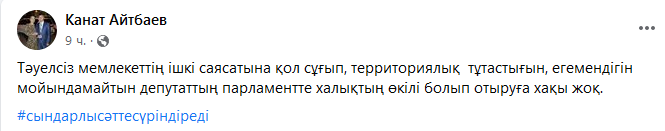 Депутат мажилиса и член партии "Ак Жол" Азамат Абильдаев признался, что поддерживает Россию в военных действиях против Украины, передает медиапортал Сaravan.kz. Соратники по партии назвали политическую позицию Абильдаева "личным мнением" и не стали его осуждать. Взамен это сделал Канат Айтбаев, известный как отец популярного певца Димаша Кудайбергена.