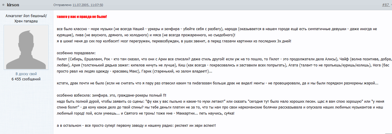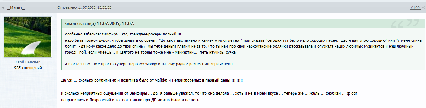 "Надо быть полной дурой, чтобы заявить со сцены: "Фу, как у вас пыльно, и какие-то мухи летают", или сказать: "Сегодня тут было мало хороших песен, сейчас я вам спою хорошую", или "У меня спина болит" — да кому какое дело до твоей спины? Мы тебе деньги платим не за то, чтобы ты нам про свои болячки рассказывала и опускала наших любимых музыкантов и наш любимый город! Пой, если умеешь… и святого не тронь! Тоже мне — Маккартни… Петь научись!" — написал по свежим впечатлениям один из присутствовавших на концерте зрителей.