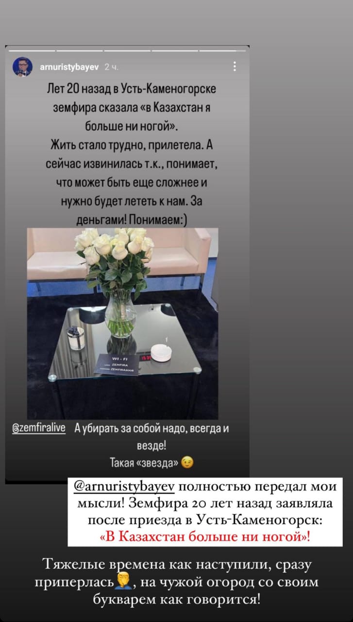 "Лет 20 назад в Усть-Каменогорске Земфира сказала: "В Казахстан я больше ни ногой". Жить стало трудно — прилетела, а сейчас извинилась, т.к. понимает, что может быть еще сложнее и нужно будет лететь к нам. За деньгами! Понимаем", — написал он.
