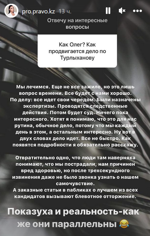 Резонансная история произошла недавно в Алматы, когда военнослужащий сын известного тренера и кандидата в мажилисмены Даулета Турлыханова напал на двух известных юристов и нанес им травмы, передает медиа-портал Сaravan.kz. Один из подписчиков спросил Анну, как себя чувствует ее муж и как продвигается это дело.