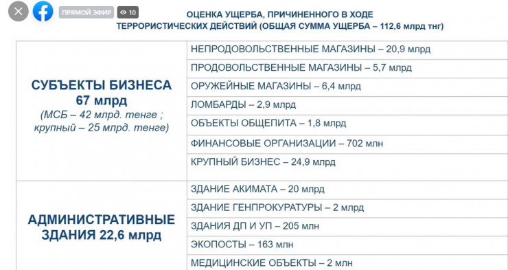 "Общая сумма ущерба для города составила 112 миллиардов тенге, субъектов бизнеса — 67 миллиардов, в том числе 42 миллиарда приходится на малый и средний бизнес. Больше всего пострадали непродовольственные магазины, по ним сумма ущерба составила 21 миллиард тенге, оружейные магазины — 6,4 миллиарда тенге. По финансовым организациям, это банки, банкоматы, ущерб составил 700 миллионов тенге. По административным зданиям Мухит Бакытович доложил", — рассказал он.
