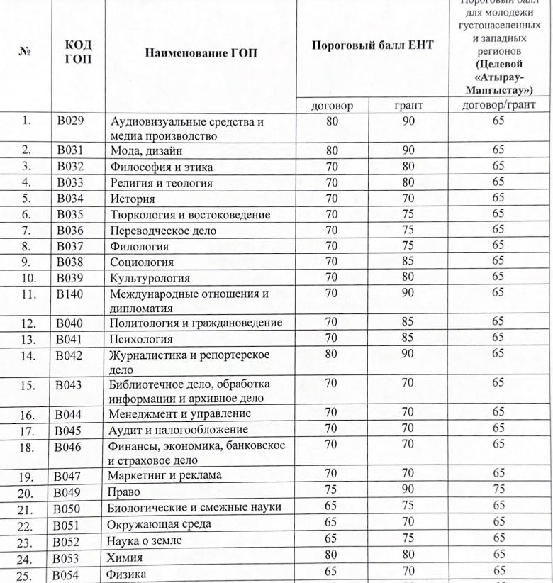 Тем не менее на сайтах вузов обычно выставляют ориентировочные цифры, основанные на том, с каких баллов начинались гранты в прошлом года. К примеру, вот так выглядят пороговые баллы для некоторых специальностей, которым обучаются будущие бакалавры КазНУ:
