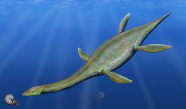 Согласно предположениям ученых, плезиозавр выглядел примерно так и мог достигать 20 метров в длину.
