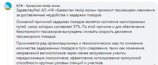 Позже стало известно, что представители "Қазақстан темір жолы" все же прокомментировали инцидент.